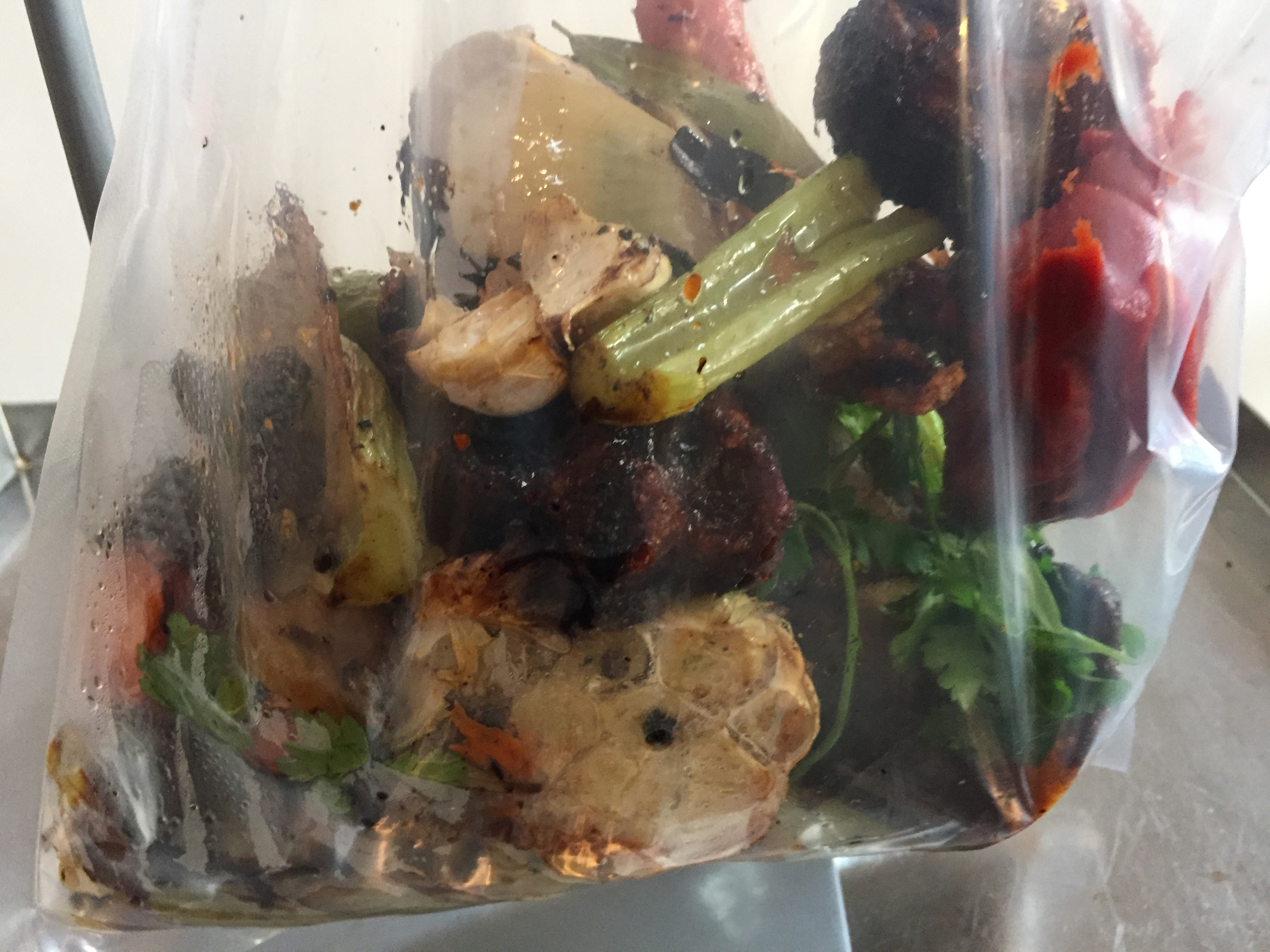 7. Using a VacMaster bag filler and appropriate sized VacMaster bag(s) carefully add the cooled roasted bones and vegetables to one large or two large bags along with the thyme, bay leaves, parsley, black peppercorns, tomato paste and water